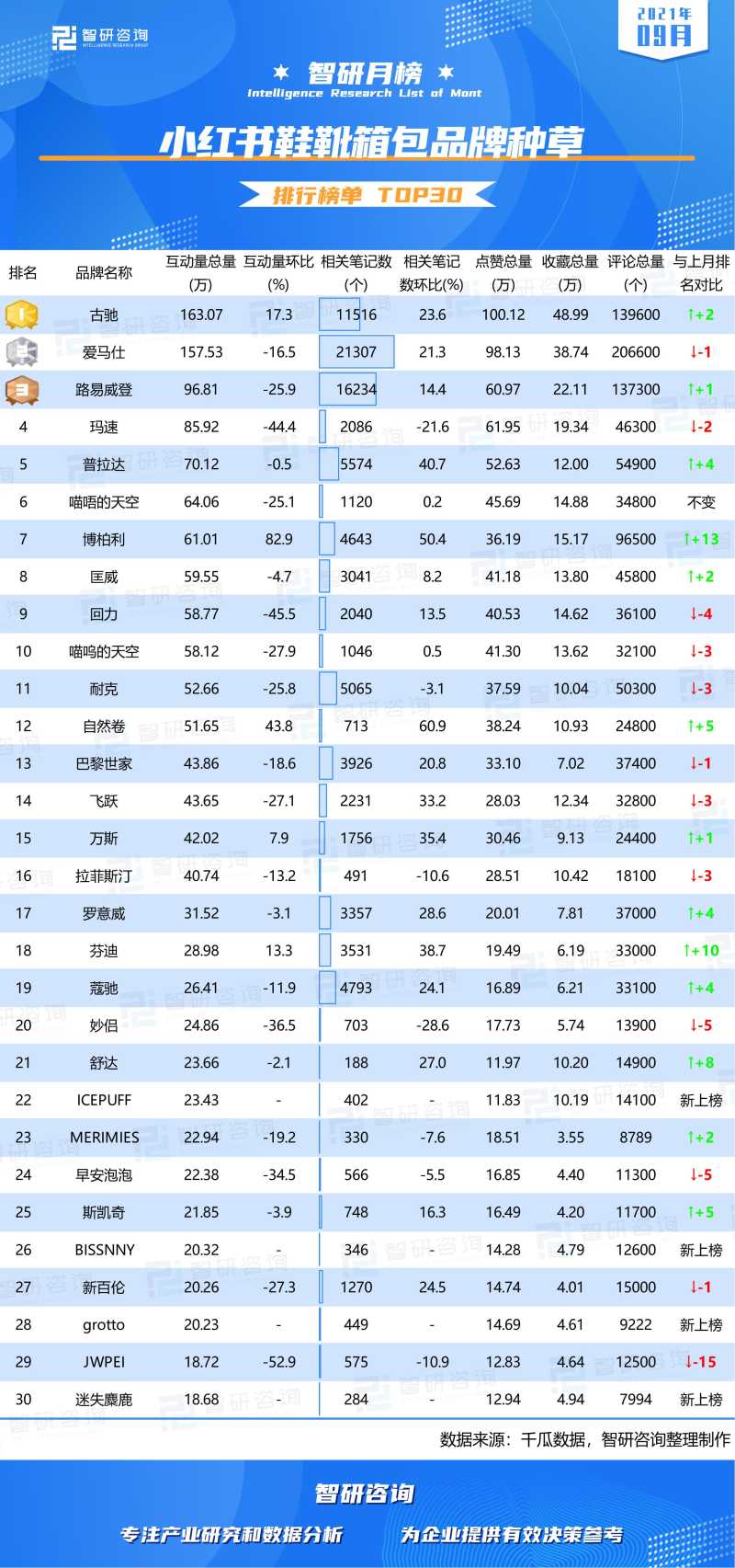 2021年9月小红书鞋靴箱包品牌种草排行榜(附月榜TOP30详单)