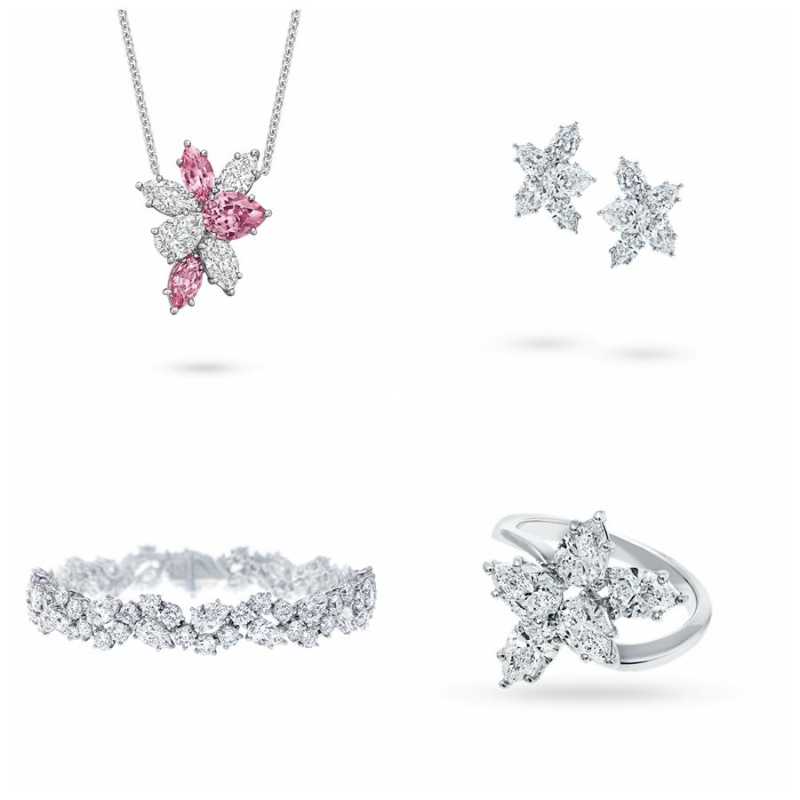 这个系列的产品以不同角度镶嵌的梨形、马眼形和圆形切割钻石打造出立体设计,可以捕捉来自各个方向的光线。