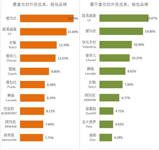 从两大榜单的排名来看,爱马仕与路易威登在消费者心中的形象存在明显争议,这两大品牌在最喜欢榜和最不喜欢榜的排名均在前两位。