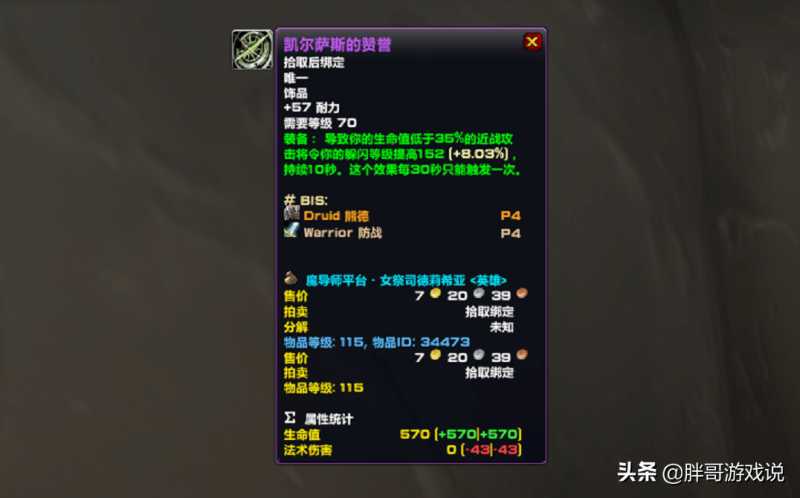 凯尔萨斯的赞誉属性可以说非常优秀,常驻的57点耐力是所有饰品中最高的,被动饰品也进一步提升了坦克的抗压能力,可以说坦克职业在TBC版本中最强生存饰品。