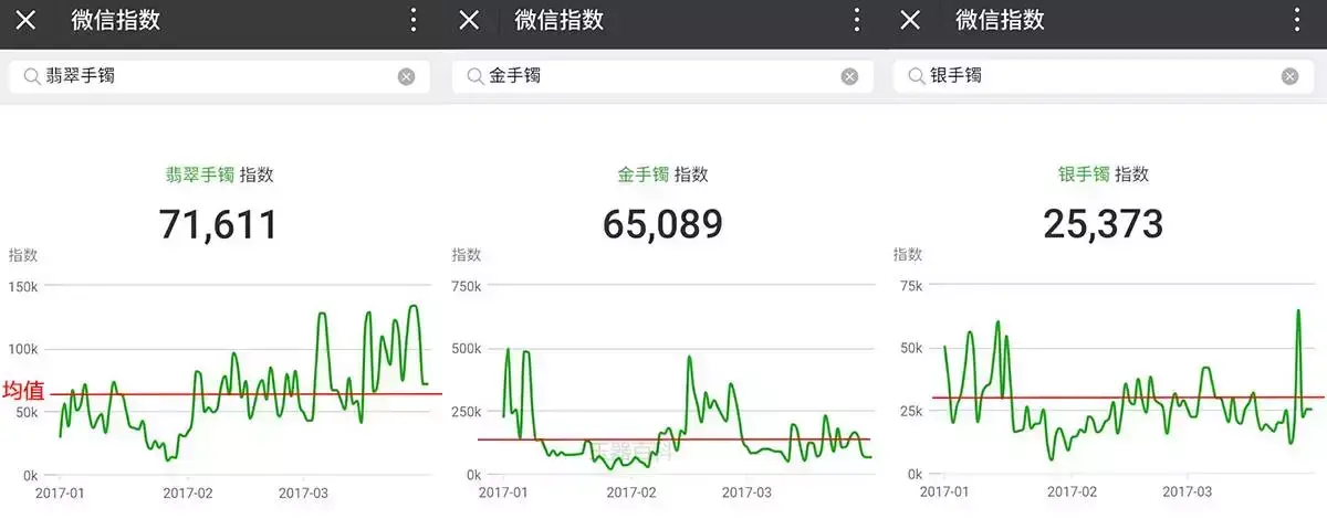 从指数上看,传统的金、银手镯在消费者当中还占有重要位置。碧玉手镯指数达到2w+,成为玉器市场一大热门,这也符合市场上对碧玉需求的表现。