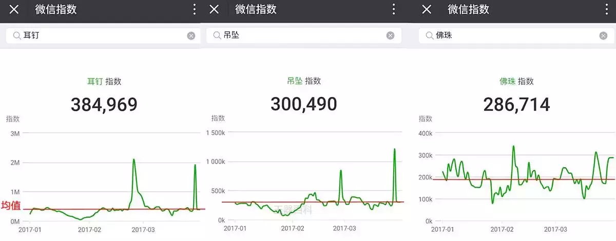 榜单前11指数普遍很高,从表中可以看到前8位指数都在20w+。不过这是单日指数,更有参考意义的是平均值,以耳钉、吊坠、佛珠三者的均值(红线所示)看,90天内的指数都在10w+以上,可以说是相当高的。