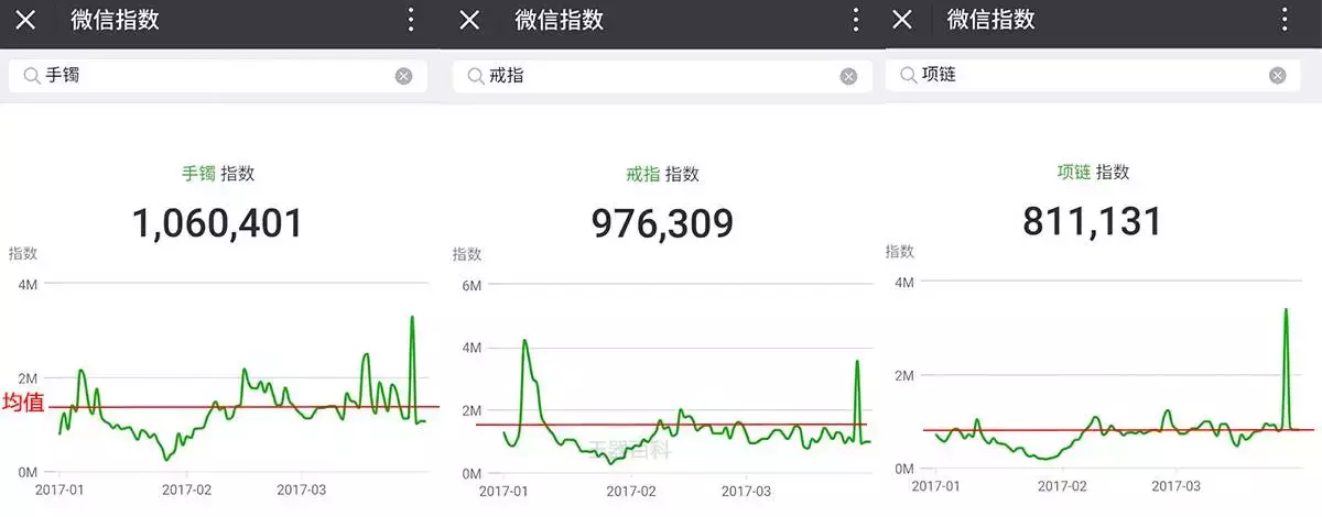 如今,谈婚论嫁无不需要一枚结婚戒指,不管是金戒还是钻戒或是其它都少不了。项链同样是女人最爱饰物之一,一条精美的项链让人魅力倍增,自信百倍。戒指与项链指数也是非常高,前三名中指数均值都在100w+上下,可见热度之高。