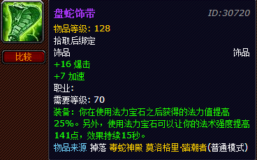 盘蛇可以说是一个尴尬的饰品,通常有盘蛇的法师都不缺其他饰品,比如薄片古头,没盘蛇的法师一般又不会为了拿盘蛇去打毒蛇,毕竟又臭又长,但作为奥法较好的一个饰品,盘蛇还是吸引了很多人,在TBC后期缺命中的情况下,盘蛇成为很多奥法补齐短板的极品。