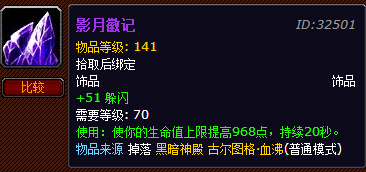 并不是我对影月徽记不感冒,只是它的图标也太普通了吧,抛开这点谈属性效果,徽记仍是非常优秀的防御饰品,相信当时有不少人为了徽记打了无数遍血沸,但出的都是完美恢复法杖,怎么想想就忍不住偷笑呢。