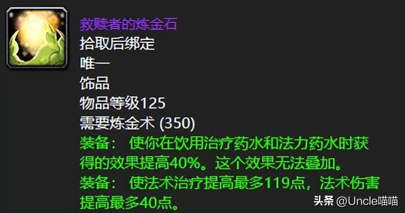 说了泰兰德的记忆,就很有必要说一说这款70版本喵叔个人认为的最强最恐怖如斯的救赎者的炼金石了,常驻法术治疗比蛋花还多一点,再者法力药水40%的效果提高那真的是丧心病狂啊,太过BUG了,不过主要是这东西需要破碎残阳的声望崇拜,我的老铁海涛就是为了这东西夜以继日的肝声望,真心恐怖如斯。
