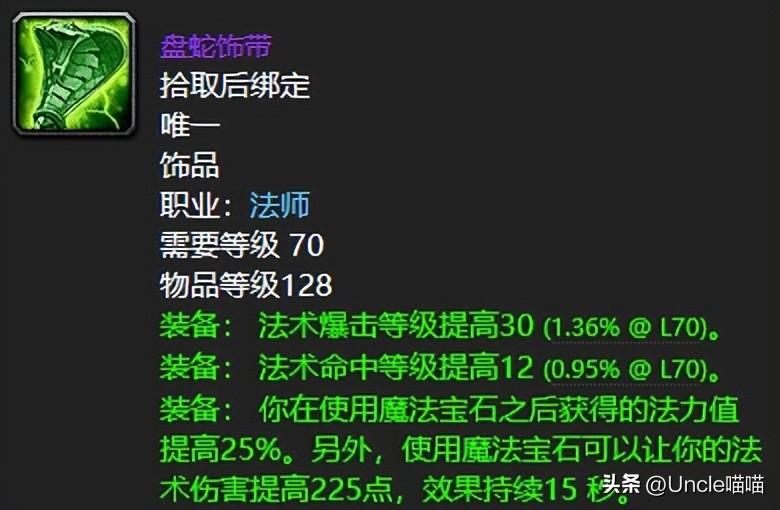 毕竟暴雪亲儿子,就连职业饰品都是给设计的那么恐怖如斯。踏潮这BOSS能不能吃排骨就看我们的盘蛇饰带了。于奥法而言这东西你拿到了说锁一个饰品栏也是没毛病的。喵叔也是在中后期强势转奥法,不过肝了几次毒蛇神殿都没有拿到这东西,好几次都是被别人高价抬走了,真真是可遇而不可求的高端尖货,太太太恐怖如斯了!