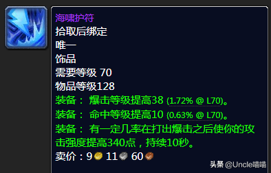 和海啸护符一样身为爆击加持的法系饰品的话其实价格高喵叔倒是能够理解,毕竟团本法系玩家多,而且这个东西的持续时间足足有15秒,相比较于10秒来说多了三分之一可谓NICE。高爆击的话无论术士、法师、元素萨都是相当香的,均价虽然高达近6000,但是也不算亏,喵叔推荐3000上下入手最香吧!
