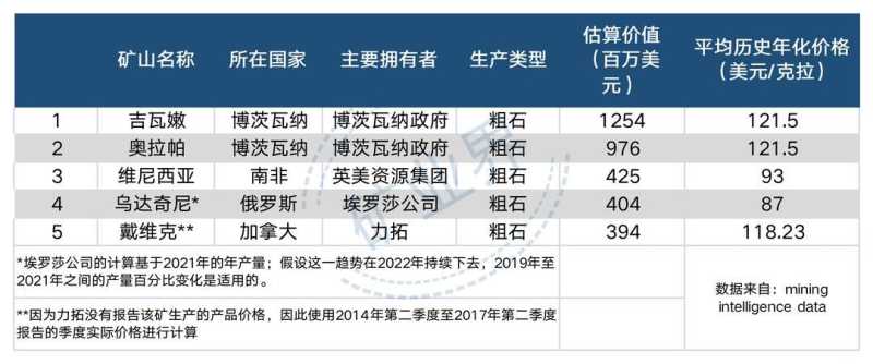 产量排名第三的乌达奇尼钻石矿,其价值排名全球第四,估算价值为4.04亿美元,平均历史年化价格为87美元每克拉。