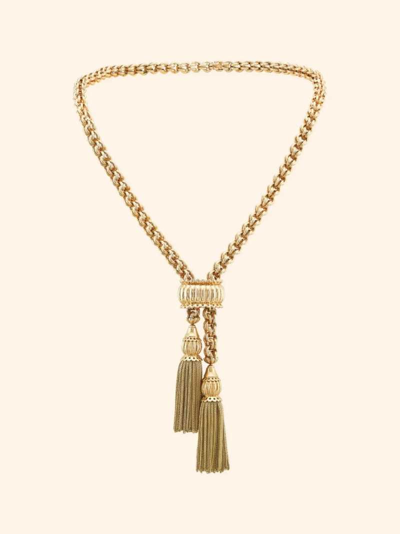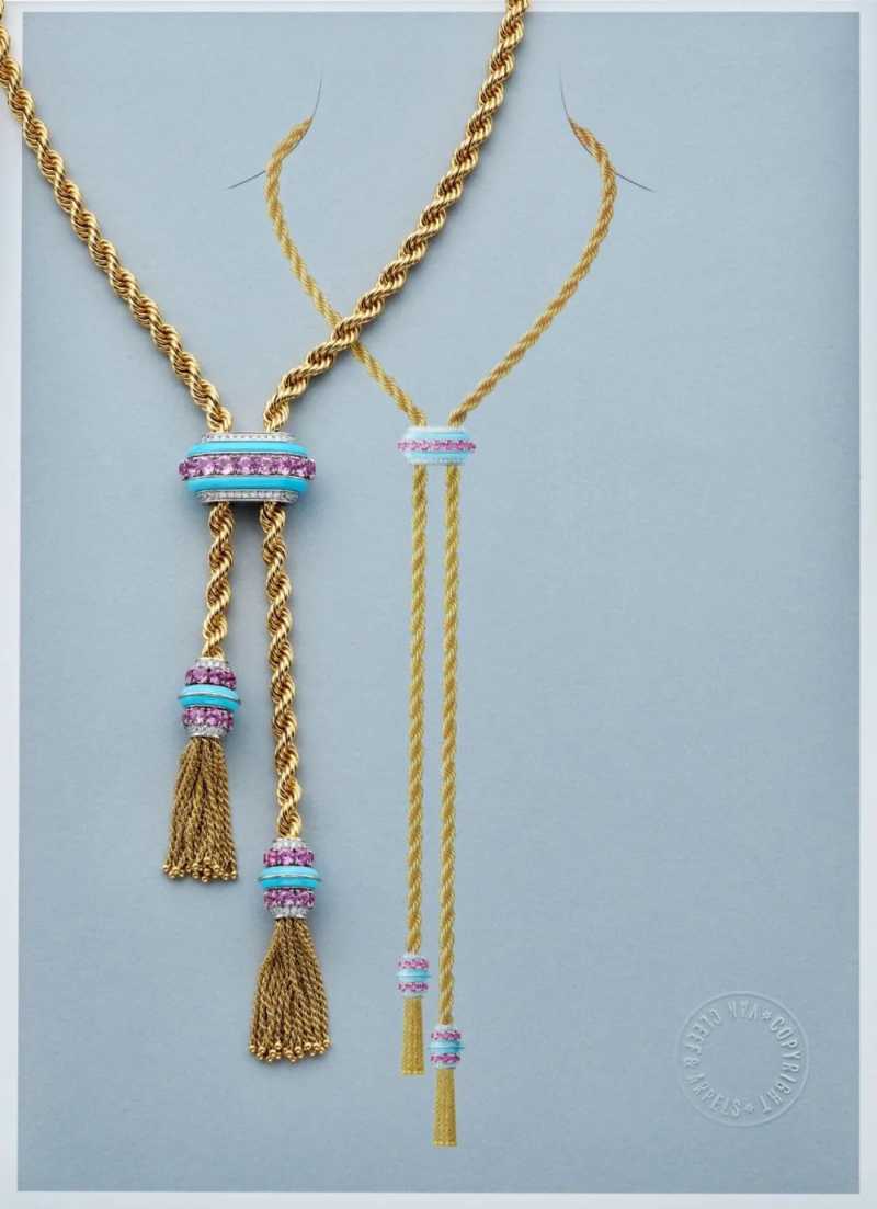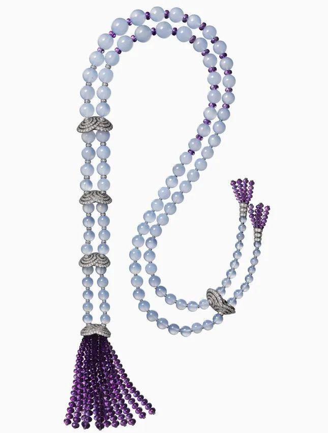 Sautoir 长项链是一种非常具有异域风情的风格,由单条或多条悬垂的长链组成,有时还点缀着流苏。近年来,它在高级珠宝中大受欢迎,几乎每年都会有亮眼的新设计,比如宝诗龙、梵克雅宝和卡地亚都有代表作。