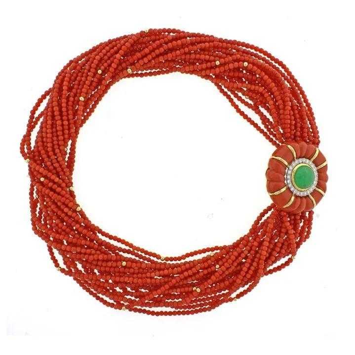 上世纪 50-70 年代这种项链非常流行,最常用的材质是珍珠和珊瑚,最擅长的品牌是蒂芙尼,前后两位珠宝大师 Jean Schlumberger 和 Paloma Picasso 都推出了不少经典作品,前者一如既往地热爱色彩,不拘一格地运用各种宝石,并巧妙地打造了“关节”,可以将长项链变为短项链+手链的组合。