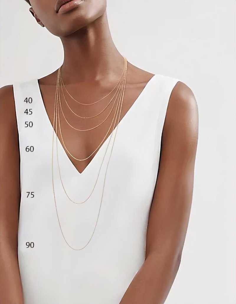 经常用到的长度种类有 4 个:Princess 项链(40-45 厘米),Matinee 项链(50-60 厘米),Opera 项链(75-90 厘米)和 Rope 项链(90 厘米及以上)。