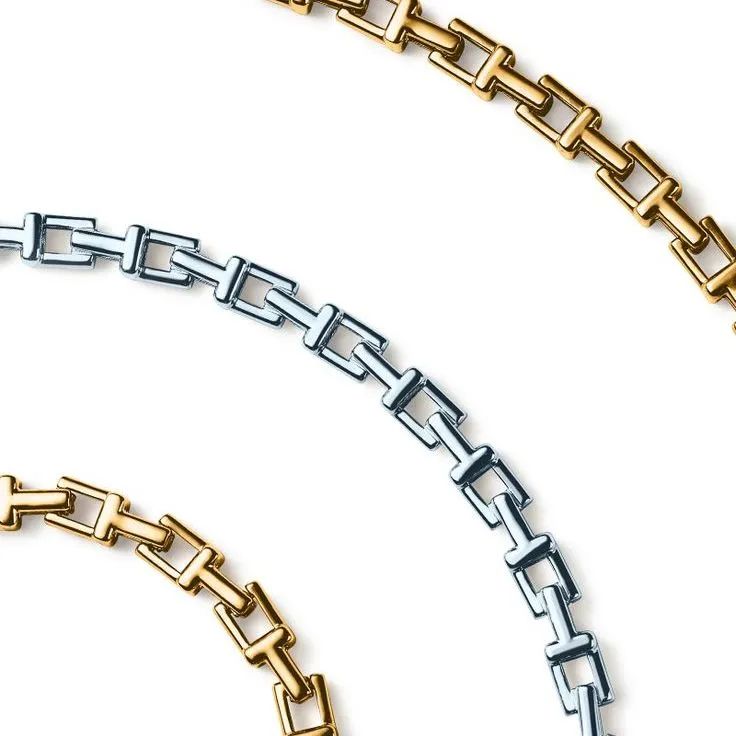 当然,大牌们也会推出自己独家设计的链条项链,比如 Tiffany & Co. 的 T 系列就是用 T 形字母作为单个链条的造型,而 HardWear 系列则用了回形夹来凸显摇滚硬朗的街头风。