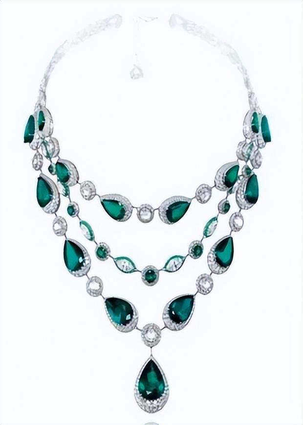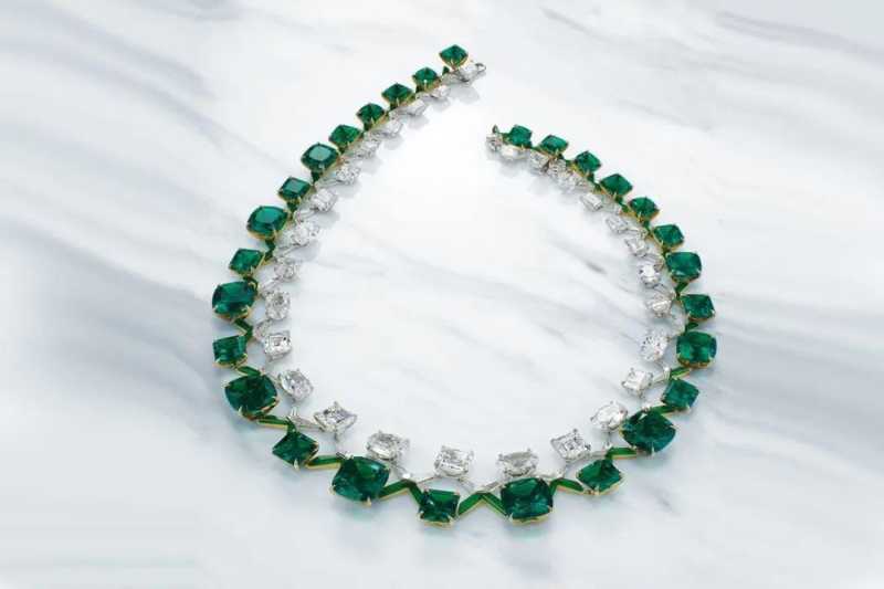 因此这种 Rivière 项链因为够经典,因此从未消失过,各个珠宝大牌都有设计。比如 Boghossian 的双排 Rivière 项链,镶嵌 28 颗 10.41 克拉至 1.48 克拉的垫形和八角形切割祖母绿,以及 22 颗 4.22 至 0.70 克拉的椭圆形和矩形切割钻石。