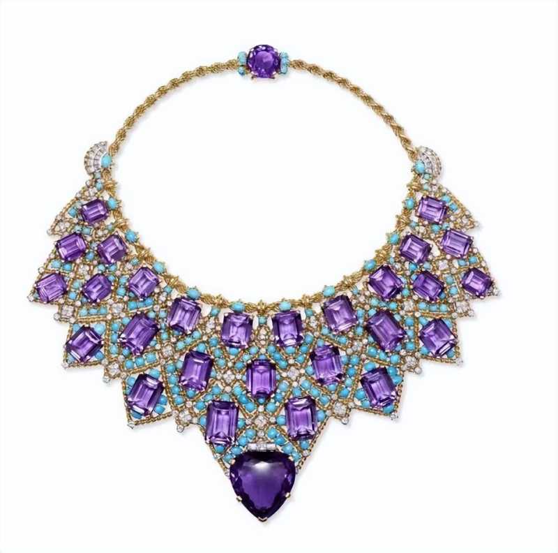 1947 年,卡地亚的 Jeanne Toussaint 为温莎公爵夫人设计了这条华丽的紫水晶、绿松石和钻石项链,它才是真正意义上的第一条 Bib Necklace,它吸收了 Patiala 项链的大尺寸和层叠概念,并从“水果锦囊”风格中找到了色彩的旋律,并以几何元素打造了这条尺寸惊人的项链,与低胸晚礼服成为了最佳 CP。当温莎公爵夫人佩戴这条 Bib Necklace 出席晚宴时,让 Bib Necklace“一炮而红”。