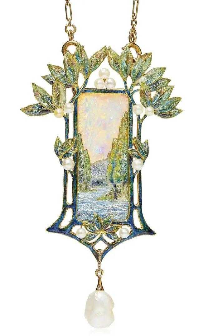 到了 20 世纪初的新艺术运动时期,精湛的空窗珐琅技艺让挂坠项链变得像一件艺术品,一件就足够吸睛。