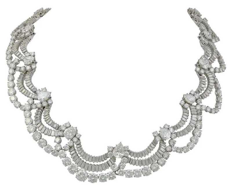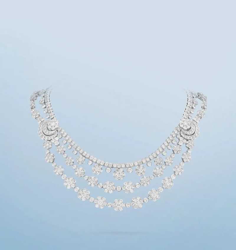 比如容易佩戴的可能是格蕾丝·凯利的那条卡地亚花环项链,只有简单的三排设计,不同形状的切割钻石简单地勾勒除了花环的垂饰效果,更现代也更百搭。