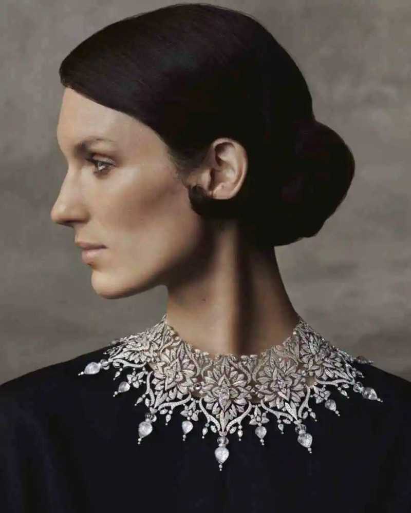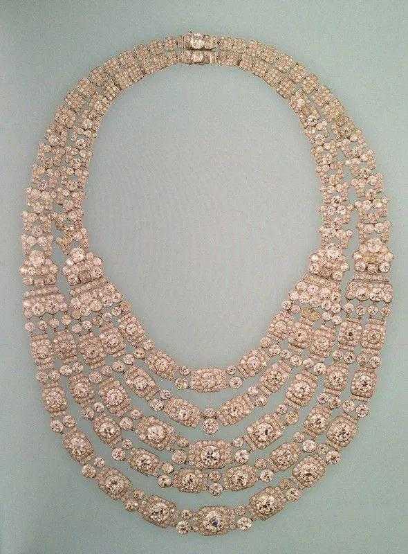 Bib Necklace 是由许多层状链条或单个大元素组成,覆盖整个胸部。最开始发源卡地亚的印度风,毕竟印度大君们就喜欢这种巨大的珠宝,比如 1920 年代 Patiala 大君 Bhupinder Singh 定制的五层 Patiala 项链,以著名的重达 234 克拉的戴比尔斯黄钻为中心,总共镶嵌了超过 2,930 颗总重近 1,000 克拉的钻石。