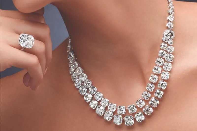 Ronald Abram 的双排钻石项链镶嵌 119.03 克拉古董枕形切割钻石。