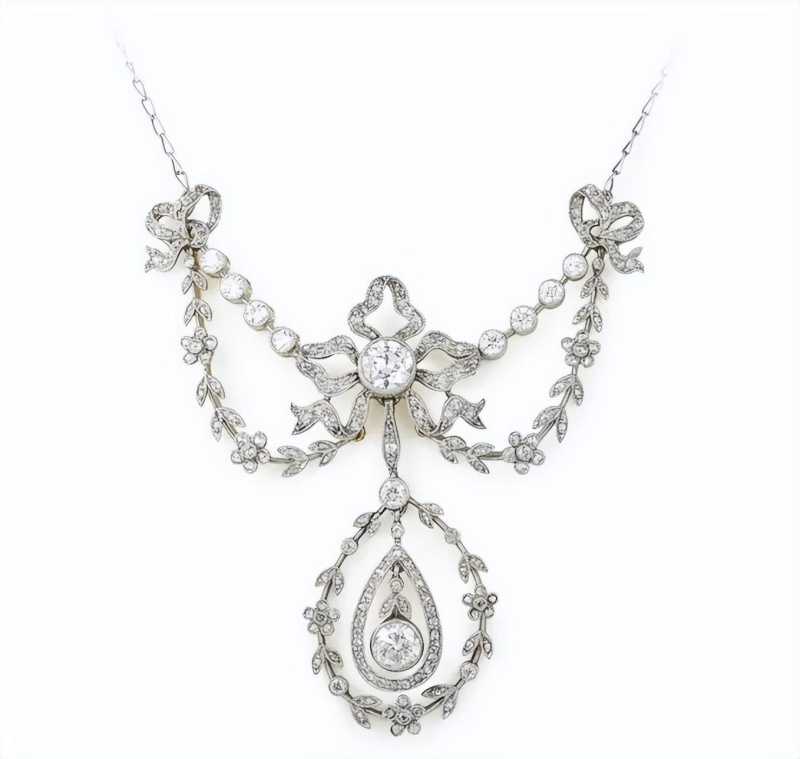 花环(Festoon)项链最早出现在格鲁吉亚时期,并一直延续到维多利亚时代和爱德华时代。最开始它总是以自然主义元素,比如花朵、叶子和藤蔓的造型为中心,以各种链饰或垂饰发散扩展,比如花环、丝带之类的造型,确保项链具备足够的装饰性。