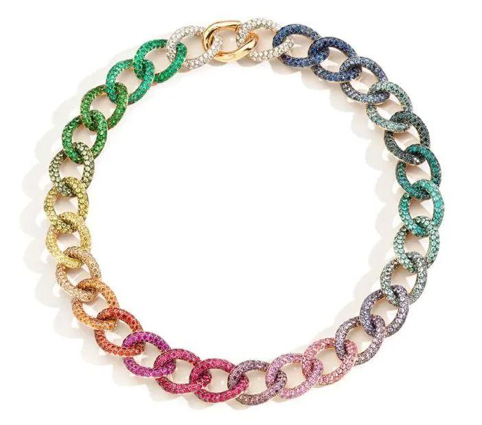意大利珠宝品牌 Veschetti 喜欢用鲜艳的色彩和夸张的尺寸来表达对生活的热爱,他们的 Sautoir 长项链总是让你眼前一亮,因为设计师总是偏爱那些拥有高饱和色彩或自带幻彩效果的宝石,比如青金石、珊瑚、欧泊和珍珠母贝。并用大 Size 的几何链条来匹配,极度适合 80 年代复古风。