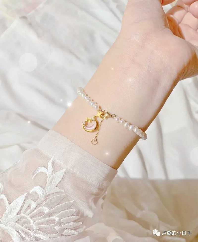 还有这款粉贝星月手链,小颗的粉贝与钻石,加上星月元素,妥妥的仙女气质款。
