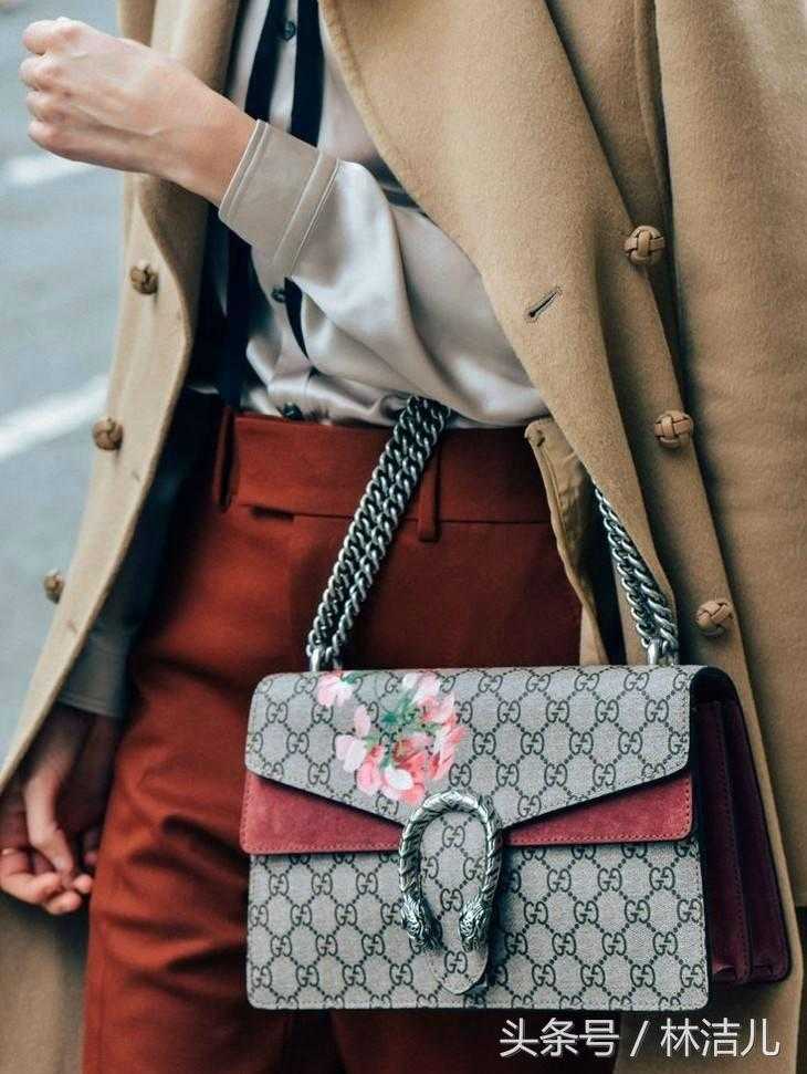 Gucci不愧是“宇宙大牌”,这款才推出不过3年的“酒神包”,不需要Miss林过多介绍,早已红遍全球,它可以说是帮助Gucci翻身的奠基之作,马蹄形蛇头金属扣让你远远就能认出它来。
