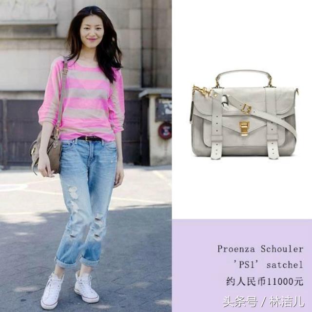 刘雯也用它来街拍凹造型,破洞牛仔裤以及白色帆布鞋给人轻松休闲的感觉。粉色条纹的上衣又显示出少女的活泼可爱。背上ps1的包包让刘雯成为街头的super star。