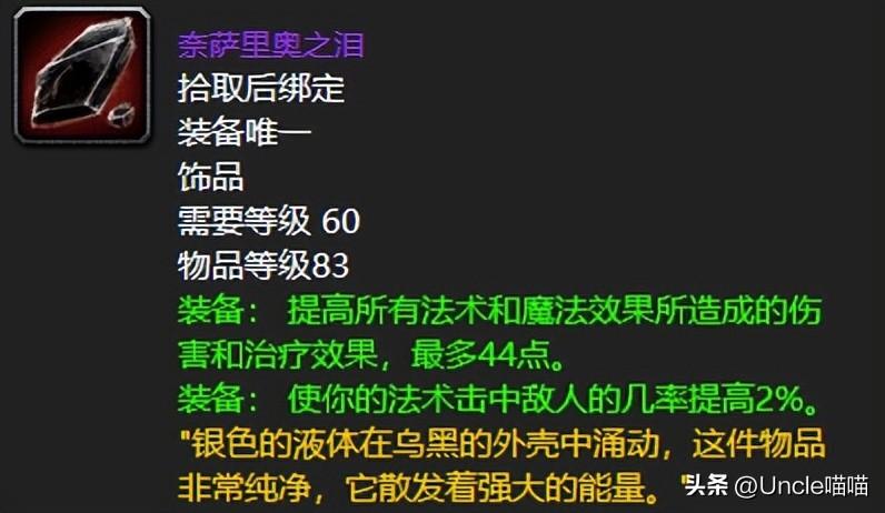 奈法利安的奈萨里奥之泪,霸榜第一位子是毫无问题的。任何法系输出如果你说60年代没拿到过这东西,那么喵叔我想你的生涯都是不完美的。无论如何是你追求极致道路上必肝的神器,一经拥有可就是直接毕业的存在,堪称性价比之王,茁壮的喵叔再一次无情的为它狂戳起我家天花板,我戳我戳我戳戳戳!