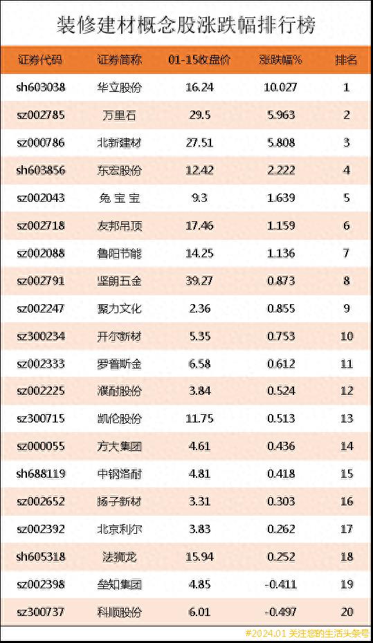 装修建材概念股涨跌幅排行榜(前20)