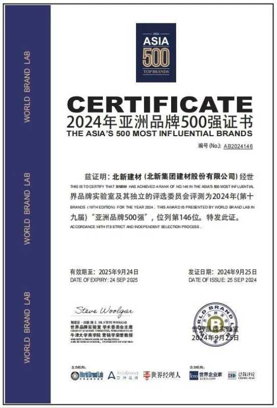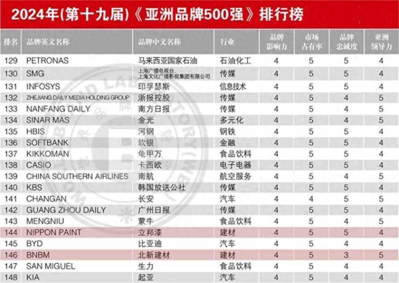 在2024《亚洲品牌500强》排行榜中位列146位的北新建材,排名比上年前进2位;在上榜的建材品牌中,北新建材次于所属母集团旗下的中国建材(第86位)和立邦(第144位),再次蝉联亚洲建材品牌三强,并将跟立邦的距离缩小至2位。