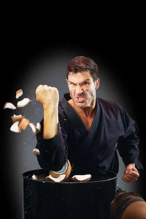 2013年6月24日,在美国加利福尼亚州洛杉矶的吉尼斯世界纪录现场,表演家及武术师杰弗里·詹姆斯·利波尔德(美国)一分钟内用胳膊肘压碎了21个椰子。