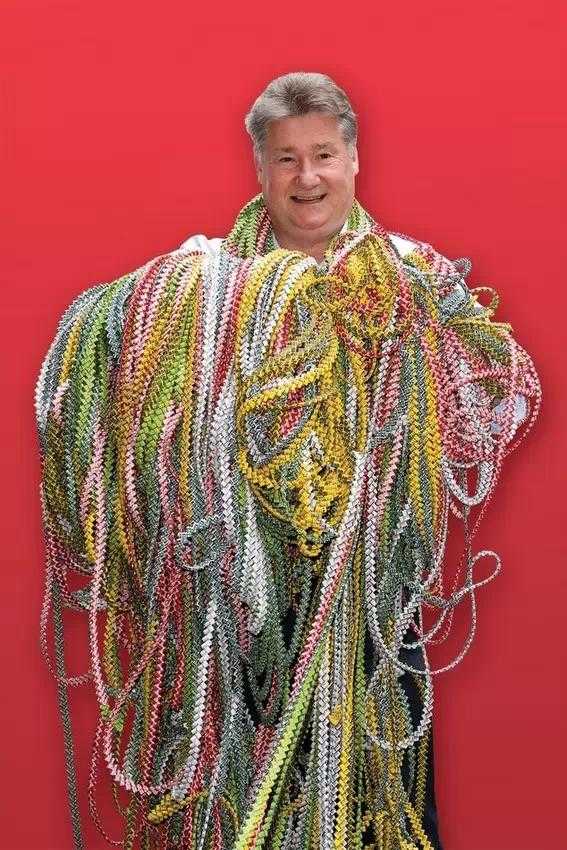 加里•杜施尔(美国)用口香糖包装纸拼接起的环环相扣的链条已达23.9千米— 约合230个足球场的长度!加里从1965 年3月11日起开始连接口香糖包装纸,截止到2014 年3月已用3,743,076个链扣连接了1,871,538张包装纸。