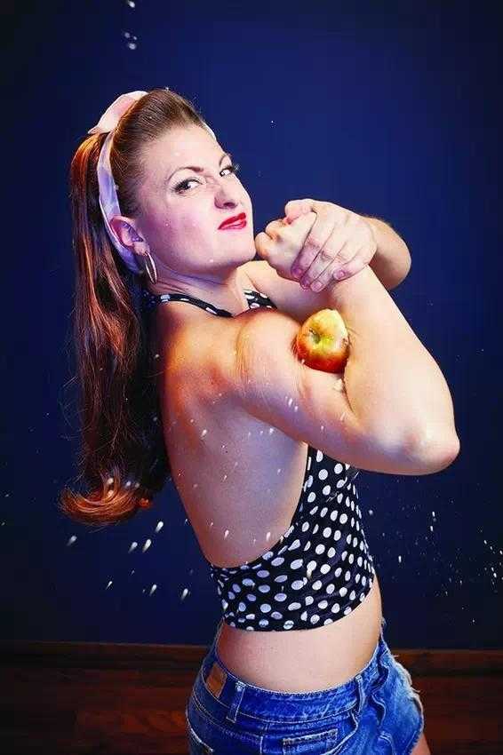2013年6月26日,在美国加利福尼亚州洛杉矶,美国的卢妈妈(原名林赛•林德伯格)用肌肉的力量压碎了8个苹果。她曾是一名会计师,后辞职专门从事表演,现在可用肱二头肌把热水壶爆开,还可以把电话簿撕成两半。