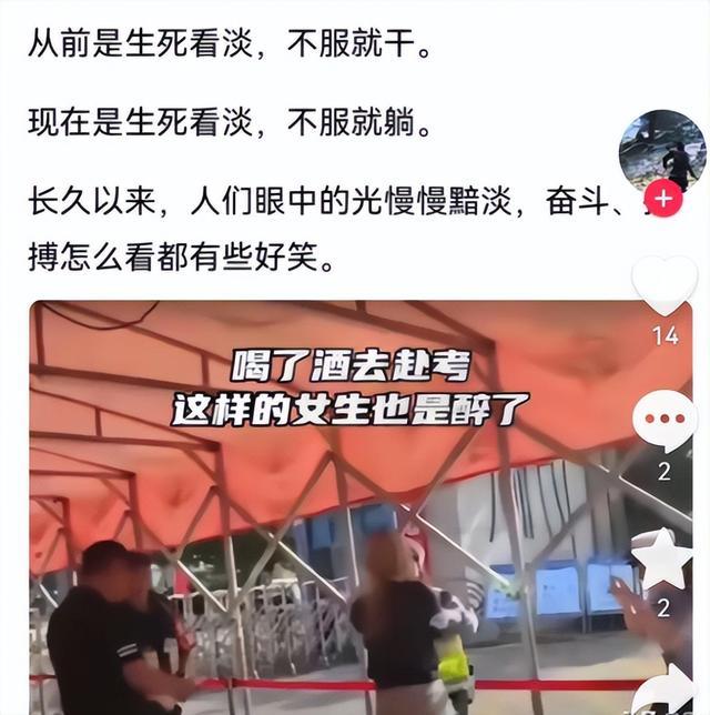 比如说今年湖南一场“醉考”事件瞬间引爆网络,一名黄头发短裤女子醉醺醺地出现在考场门口,整个人摇摇晃晃。