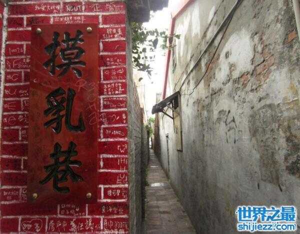 摸乳巷又叫做是护胸巷,地处台湾。因为巷子非常窄而得名(70公分)。两个人是不能直面经过的,要侧着身子才能走过去,有的女性胸围较大,难免会被碰到,所以啊,摸乳巷的得名就是这样来的,原来胸围太大也不好啊,如果让世界上最大的胸部的女人经过,我估计会卡在里面了。