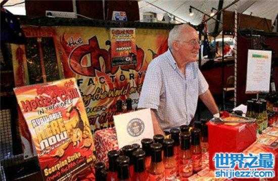 人们为了挑战辣椒的程度,也真是豁出去了,这位英国餐馆的老板——穆罕默德·卡里姆,但是世界第一辣酱的发明者,它采用的辣椒是非一般的辣椒,上去的话来说,警察所用的辣椒水,它的辣度也仅仅只有两百万个单位。但是这个辣椒酱足足有1200万个单位。