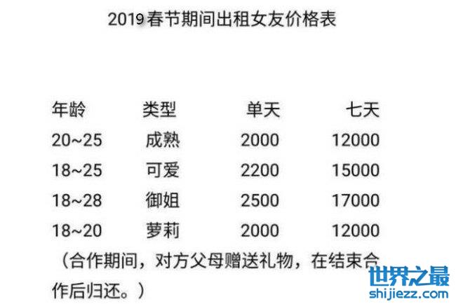 其实,“租女友”在前两年就很流行了。当时想租一个女友,只需到婚介所或者相亲网站资讯即可。租女友的价格一般是500元起步,由中介晒出价格,双方都有意向后再见面详谈出租期间的具体费用。而今年,有人早早的就在网络上发帖租女友,表明500元一天,结果无人问津,显然这个价格已然被淘汰了。原来,今年的价格飙升,女友出租最低费用单天就高达2000元,还有几种类型可供选择,可以说相当全面了。