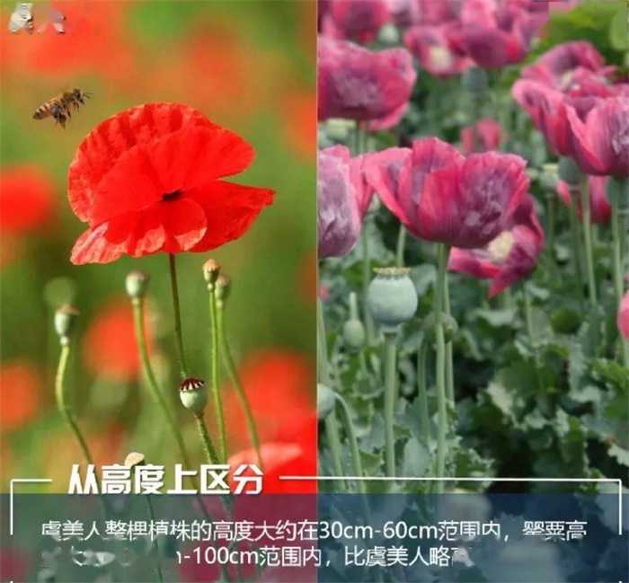 罂粟花大概在30~150cm的高度,相比于虞美人要略高一些,而虞美人的高度大概在30~100cm,整株看起来较为细弱。罂粟花开花会有重瓣的情况主要是红色,而虞美人在花瓣上一般是4片,在颜色方面会有各种各样的,花的边缘是比较平滑的。