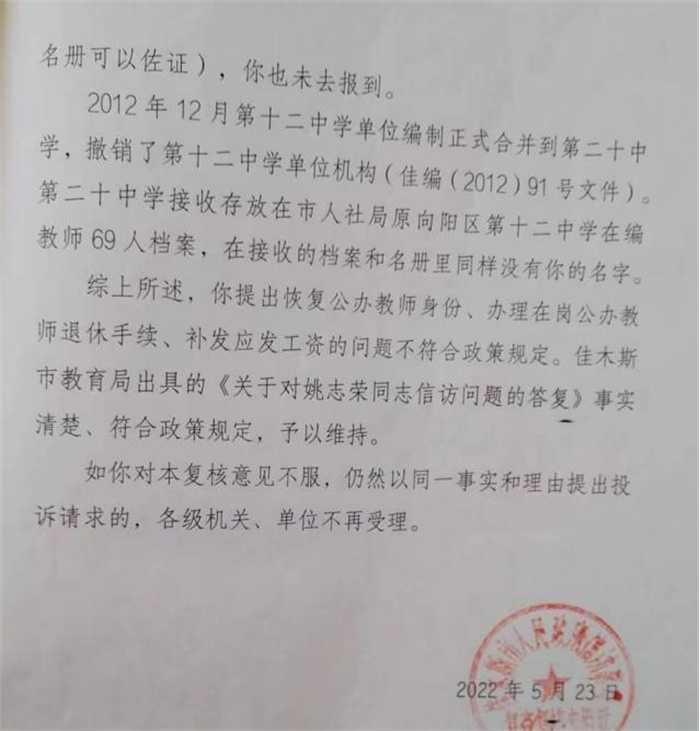 退休前夕,原来作为黑龙江佳木斯向阳区第十二中学的教师姚某发现自身查询过程中发现教师编制没有了。姚某向多个部门反映了这一问题。要求对其教师身份作出恢复,办理在岗公办教师退休的手续,对其工资作出补发,在当地的教育局和信访局先后对这一要求作出回应,表示其并不符合上述的规定要求,无法满足提出的这一要求。