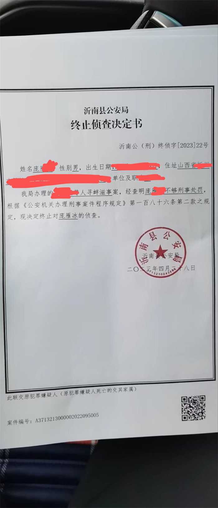 北京时间4月28日,有新闻记者从庞雁冰当中获得消息,他今天收到了山东省沂南县公安局终止侦查决定书,被要求终止侦查,决定书当中显示沂南县公安局办理的苗某人人寻衅滋事案,经查明庞雁冰不够刑事处罚,决定终止对庞雁冰的侦查,同时他也被解除取保候审,公安局还将会推出他的取保候审保证金,据了解,在今年的2月17号,当事人在网上面因为发文质疑交通执法有违规,遭到了山东沂南县警方跨省抓捕的这件事情,他被关押了18天。