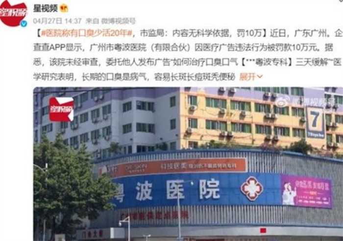 广州市粤波医院由于委托他人发布未经审查的治疗,口气口臭三天缓解的广告被罚款10万元。所发布的广告语上称病气是出现长期口臭的原因,长期口臭容易加速身体容貌的衰老,容易口舌生疮,长斑长痘,甚至出现斑秃便秘。如果患上口臭,寿命会相对减少15~20年。这些广告内容并没有任何科学依据,对于治疗时间上的保证和锻炼等都属于违规违法的行为。