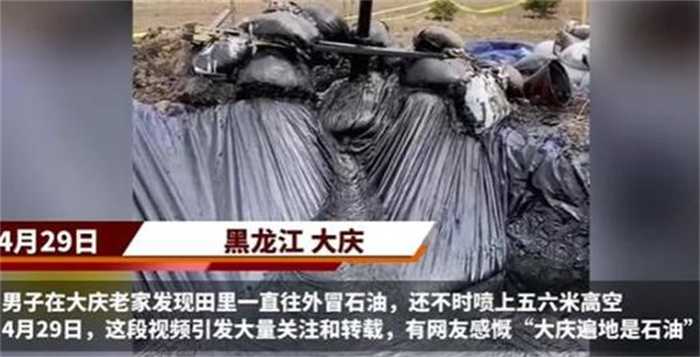 网传的视频中显示农田中间有一处大坑,坑上铺满了黑色的薄膜,坑顶有一个小孔,正在不断的往外冒着黑色的液体,依次是石油,偶尔还会向上喷出很高。发布视频的男子表示出油的速度特别快,甚至能够喷出五六米高。视频中农田的地址是黑龙江大庆。该视频在网络上被不断的转载,网友们不禁感慨大庆果然处处是石油。
