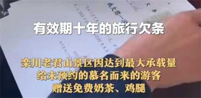 北京时间5月1号,河南洛阳栾川县老君山景区,因为接待游客人数已经达到上限,而导致很多牧民前来观光旅游的游客没有能够成功进园旅游园区为了进一步安抚游客的情绪,也给近千名游客打上一张欠条,欠条上写着我欠您一次旅行,凭借该欠条可以免费观光一次有效期十年。很多游客对于景区打欠条的行为感到非常的暖心。虽然千里迢迢驱车前来观光旅游,最终并没有成功进入景区,但是景区的这种做法没有让游客寒心。
