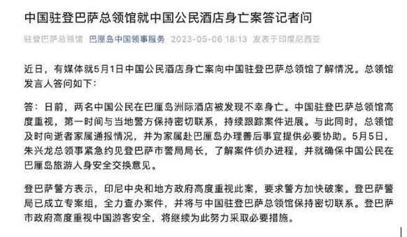 对于这件事,中国的领事馆也表明相当的重视,并且在第一时间就和当地的警方取得了联系,持续跟踪案件的进展,与此同时,领事馆也及时地向逝者家属通报相关的情况,并为死者前往巴厘岛处理后续事故提供一定的协助,印尼的警方表示,印尼中央和地方政府的高度重视这个案件,目前已经成立了专案小组,将会全力的查办案件,同时也会和中国领事馆的负责人保持密切联系,为中国游客的安全采取必要的措施。