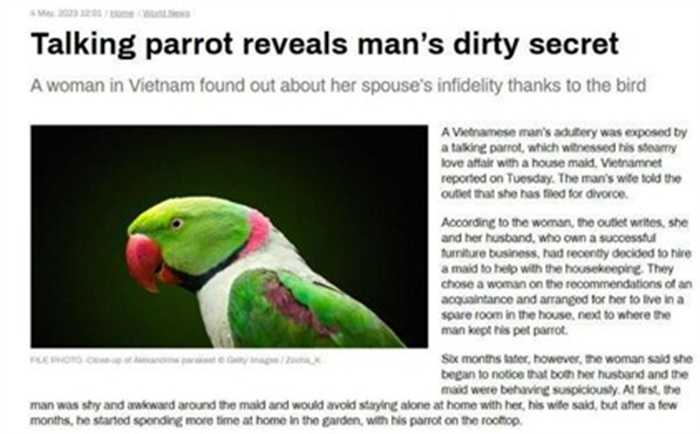 北京时间5月4日,在越南地区一户人家的宠物15因为帮助女主人找到丈夫出轨的证据,从而登上了热搜,越南的当地媒体也对此也进行了报道,这位女主人公在接受采访的时候表示自己已经提出了离婚的申请,据了解,这名女人和自己的丈夫经营一家家具企业,由于自己的业务比较繁忙,两个人决定找一名女佣来处理自己的家务,而且这一名女佣也是熟人介绍来的,他来到两个人住的地方以后,他的卧室就紧挨着他老公养鹦鹉的房间。