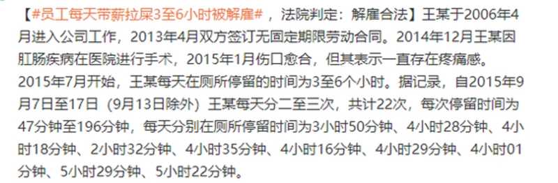 5月24日晚一则“员工每天带薪拉屎3到6小时被解雇”的新闻登上了网络热搜,据了解当事员工王某在2006年4月份进入公司工作,在2013年4月双方签订了无固定期限的劳动合同,却由于个人行为被开除。