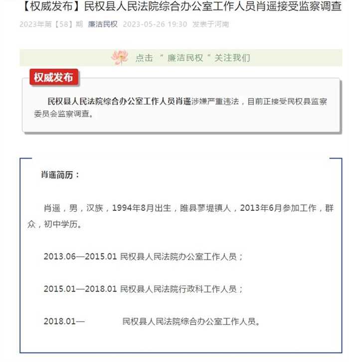 近期90后干部的一些贪腐现象也引发了社会方面的关注,根据公开资料能够看到,自从今年以来,至少5名90后的干部相继被查。根据河南民权县纪委监委微信公众号“廉洁民权”,5月26号所带来的消息,民权县人民法院综合办公室工作人员肖遥涉嫌了严重违法违纪,正在接受民权县监察委员会的监察和调查。