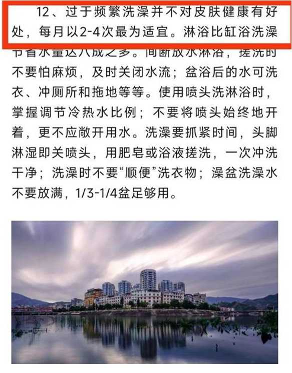 因为高温少雨天气所造成的影响凉山会东县城镇居民生活饮用水源出现了告急情况,当地自来水公司也发布了公告,呼吁广大市民对水原要节约使用,其中有一条建议表示,过于频繁洗澡对皮肤健康并没有太大的好处,每月洗澡以2~4次为适宜,这也让市民广泛热议起来。