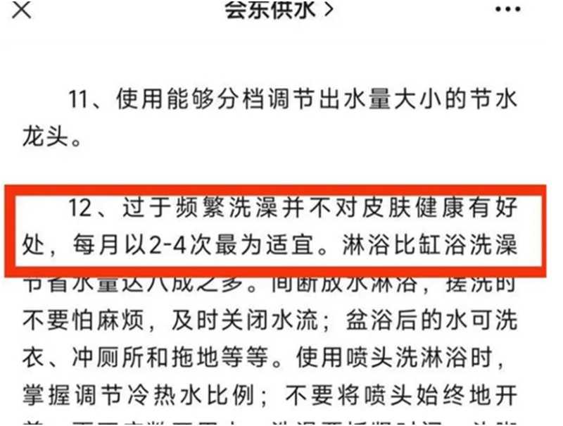 对于市民的一些疑惑,5月29日相关公司的负责人在接受记者采访时,表示供水系统发出的节约用水相关通知中提出的每月洗2~4次澡最为适宜这样的说法,这很可能是冬天时候所发布的通知,冬天一个月洗4次澡,这就是比较正常的情况,也并不是限制一个月只能洗澡这么多次,可以根据实际情况去用水。
